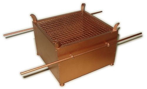 The Altar was to be constructed of acacia wood and overlaid in bronze, 7 1/2 feet square and 4 1/2 feet tall. It would have four horns, one on each corner, and pans underneath to catch the ashes of the burnt offering. The pans, shovels, basins, and forks would be made of bronze as well. There would be a grate underneath, and rings on the four corners by which to carry the altar with poles.