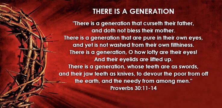 11 There is a generation that curses its father, And does not bless its mother. 12 There is a generation that is pure in its own eyes, Yet is not washed from its filthiness. 13 There is a generation—oh, how lofty are their eyes! And their eyelids are lifted up. 14 There is a generation whose teeth are like swords, And whose fangs are like knives, To devour the poor from off the earth, And the needy from among men. 15 The leech has two daughters—Give and Give! There are three things that are never satisfied, Four never say, “Enough!”: 16 The grave, The barren womb, The earth that is not satisfied with water—And the fire never says, “Enough!” 17 The eye that mocks his father, And scorns obedience to his mother, The ravens of the valley will pick it out, And the young eagles will eat it. 18 There are three things which are too wonderful for me, Yes, four which I do not understand: 19 The way of an eagle in the air, The way of a serpent on a rock, The way of a ship in the midst of the sea, And the way of a man with a virgin. 20 This is the way of an adulterous woman: She eats and wipes her mouth, And says, “I have done no wickedness.”