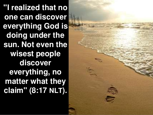 16 When I applied my heart to know wisdom and to see the business that is done on earth, even though one sees no sleep day or night, 17 then I saw all the work of God, that a man cannot find out the work that is done under the sun. For though a man labors to discover it, yet he will not find it; moreover, though a wise man attempts to know it, he will not be able to find it.