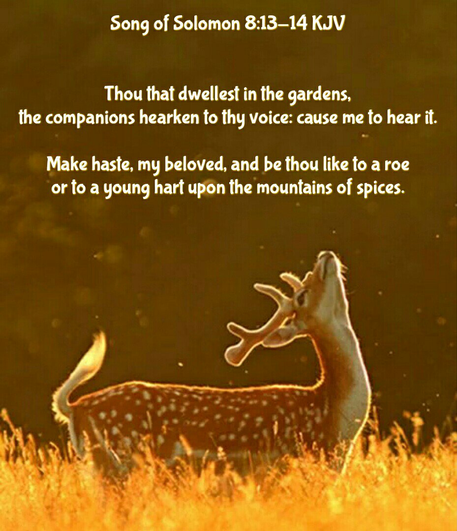 The Shulamite responds to her brothers’ contention or memory that she was like a prepubescent girl, without physical development. She says that her breasts are like towers, and she found peace in the presence of her beloved. She then describes Solomon’s vineyard, and then alludes to her own vineyard, to which Solomon has total access. In these passages, the vineyard sometimes refers to the person’s body, their physical person. If this interpretation is correct, this seems to be a statement that Solomon may have her at any time. She surrenders herself to her husband. Solomon then responds by asking her to speak to him. He longs to hear her voice! She then speaks, asking him to hurry to her, like a gazelle or a young stag. She invites him to the mountains of spices, which is also an image for her body.