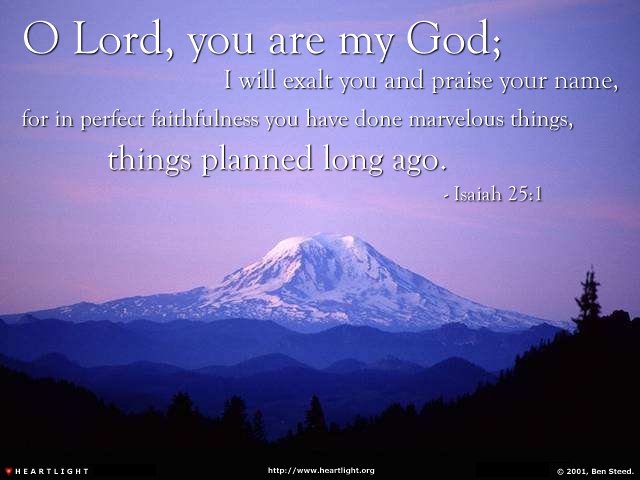 The first five verses of this chapter show the good and bad results of God’s work. He tears down the proud and evil, yet blesses and helps the needy and poor. He is a refuge to those in need and the enemy of the terrible ones. In verses six through eight Isaiah describes God as One Who prepares a feast for all people of the most choice items. He will remove the covering of death and wipe away all tears. He will lift His rebuke and restore His people.