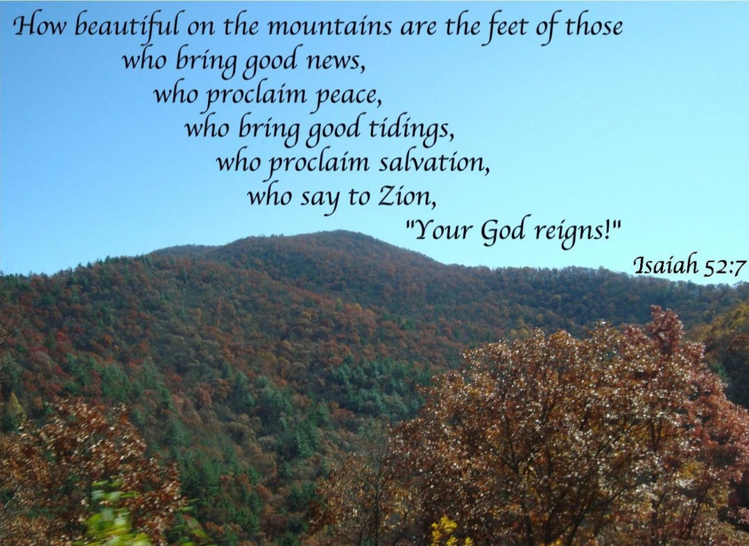 This passage contains the well-known gospel prophecy, but also relates to those who have good news about the fate of Zion. Beautiful are the feet of those who spread good news. Declare that God reigns, and let the waste places sing again. God reigns!