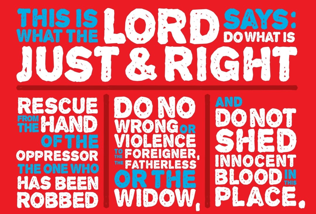 22:1 Thus says the Lord: “Go down to the house of the king of Judah, and there speak this word, 2 and say, ‘Hear the word of the Lord, O king of Judah, you who sit on the throne of David, you and your servants and your people who enter these gates! 3 Thus says the Lord: “Execute judgment and righteousness, and deliver the plundered out of the hand of the oppressor. Do no wrong and do no violence to the stranger, the fatherless, or the widow, nor shed innocent blood in this place. 4 For if you indeed do this thing, then shall enter the gates of this house, riding on horses and in chariots, accompanied by servants and people, kings who sit on the throne of David. 5 But if you will not hear these words, I swear by Myself,” says the Lord, “that this house shall become a desolation.” ’ ”