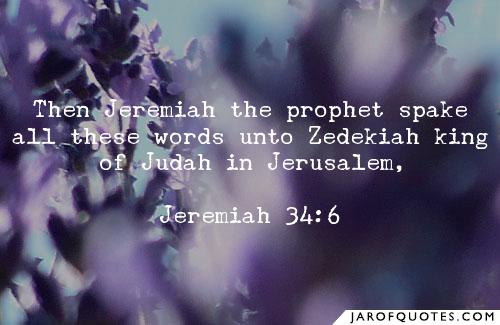 34:1 The word which came to Jeremiah from the Lord, when Nebuchadnezzar king of Babylon and all his army, all the kingdoms of the earth under his dominion, and all the people, fought against Jerusalem and all its cities, saying, 2 “Thus says the Lord, the God of Israel: ‘Go and speak to Zedekiah king of Judah and tell him, “Thus says the Lord: ‘Behold, I will give this city into the hand of the king of Babylon, and he shall burn it with fire. 3 And you shall not escape from his hand, but shall surely be taken and delivered into his hand; your eyes shall see the eyes of the king of Babylon, he shall speak with you face to face, and you shall go to Babylon.’ ” ’ 4 Yet hear the word of the Lord, O Zedekiah king of Judah! Thus says the Lord concerning you: ‘You shall not die by the sword. 5 You shall die in peace; as in the ceremonies of your fathers, the former kings who were before you, so they shall burn incense for you and lament for you, saying, “Alas, lord!” For I have pronounced the word, says the Lord.’ ”