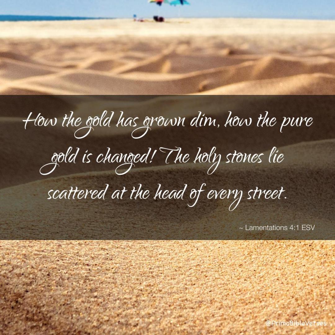 Gold is a fine metal, with great qualities that make it good for jewelry and ornamentation. Typically, it does not break down easily, and lasts long-term. So, to use it as a symbol for the deterioration of Jerusalem is a bold and strong statement of how far the city has fallen. The gold is dim. The fine metal has tarnished or deteriorated. The precious stones are out of their settings of gold, and scattered in the streets. It is a day of destruction.