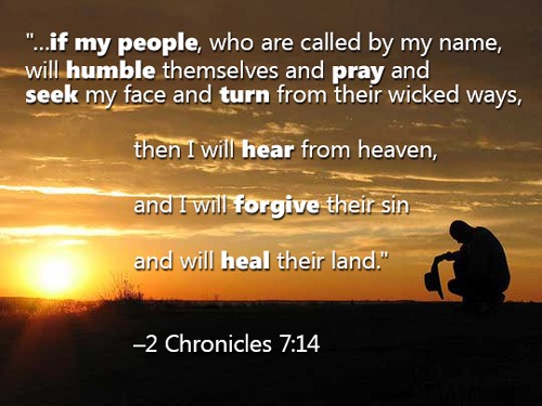 - 14 if My people who are called by My name will humble themselves, and pray and seek My face, and turn from their wicked ways, then I will hear from heaven, and will forgive their sin and heal their land.