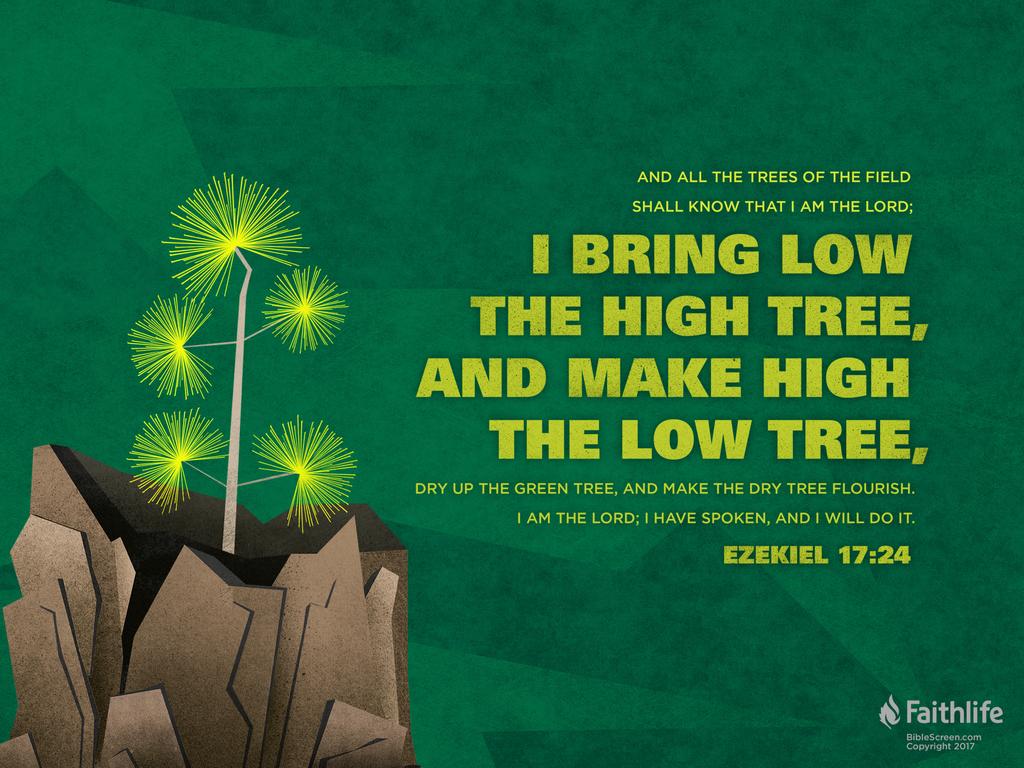 23 On the mountain height of Israel I will plant it; and it will bring forth boughs, and bear fruit, and be a majestic cedar. Under it will dwell birds of every sort; in the shadow of its branches they will dwell. 24 And all the trees of the field shall know that I, the Lord, have brought down the high tree and exalted the low tree, dried up the green tree and made the dry tree flourish; I, the Lord, have spoken and have done it.”