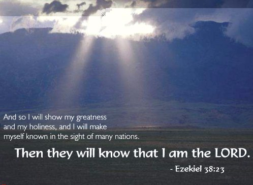 18 “And it will come to pass at the same time, when Gog comes against the land of Israel,” says the Lord God, “that My fury will show in My face. 19 For in My jealousy and in the fire of My wrath I have spoken: ‘Surely in that day there shall be a great earthquake in the land of Israel, 20 so that the fish of the sea, the birds of the heavens, the beasts of the field, all creeping things that creep on the earth, and all men who are on the face of the earth shall shake at My presence. The mountains shall be thrown down, the steep places shall fall, and every wall shall fall to the ground.’ 21 I will call for a sword against Gog throughout all My mountains,” says the Lord God. “Every man’s sword will be against his brother. 22 And I will bring him to judgment with pestilence and bloodshed; I will rain down on him, on his troops, and on the many peoples who are with him, flooding rain, great hailstones, fire, and brimstone. 23 Thus I will magnify Myself and sanctify Myself, and I will be known in the eyes of many nations. Then they shall know that I am the Lord.” ’
