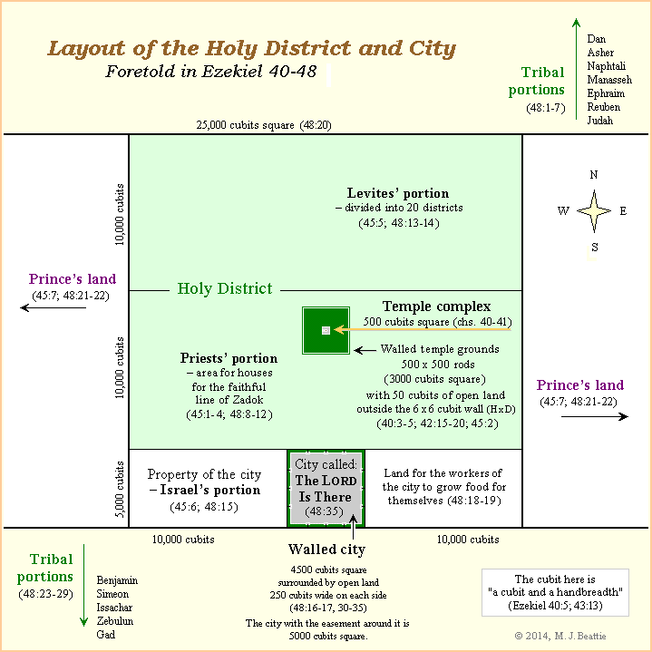 45:1 “Moreover, when you divide the land by lot into inheritance, you shall set apart a district for the Lord, a holy section of the land; its length shall be twenty-five thousand cubits, and the width ten thousand. It shall be holy throughout its territory all around. 2 Of this there shall be a square plot for the sanctuary, five hundred by five hundred rods, with fifty cubits around it for an open space. 3 So this is the district you shall measure: twenty-five thousand cubits long and ten thousand wide; in it shall be the sanctuary, the Most Holy Place. 4 It shall be a holy section of the land, belonging to the priests, the ministers of the sanctuary, who come near to minister to the Lord; it shall be a place for their houses and a holy place for the sanctuary. 5 An area twenty-five thousand cubits long and ten thousand wide shall belong to the Levites, the ministers of the temple; they shall have twenty chambers as a possession.