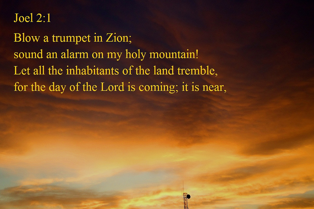 2:1 Blow the trumpet in Zion, And sound an alarm in My holy mountain! Let all the inhabitants of the land tremble; For the day of the Lord is coming, For it is at hand: