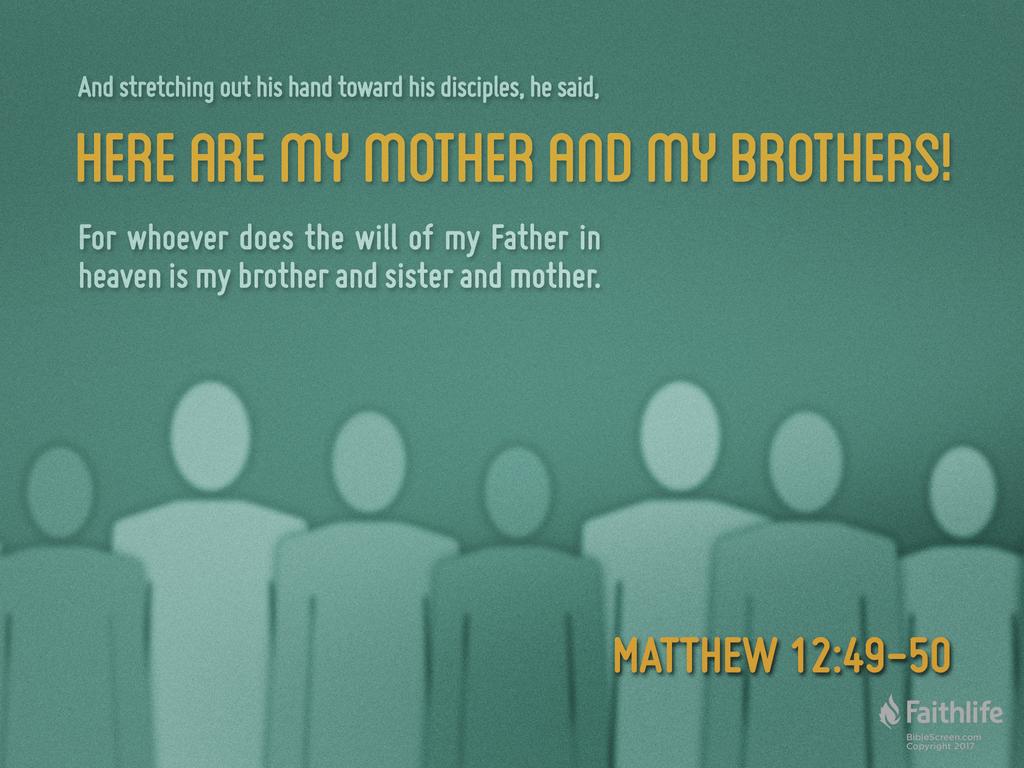 48 But He answered and said to the one who told Him, “Who is My mother and who are My brothers?” 49 And He stretched out His hand toward His disciples and said, “Here are My mother and My brothers! 50 For whoever does the will of My Father in heaven is My brother and sister and mother.”