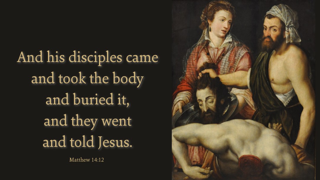 9 And the king was sorry; nevertheless, because of the oaths and because of those who sat with him, he commanded it to be given to her. 10 So he sent and had John beheaded in prison. 11 And his head was brought on a platter and given to the girl, and she brought it to her mother. 12 Then his disciples came and took away the body and buried it, and went and told Jesus.