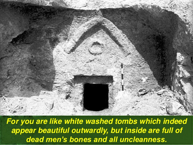 Jesus addresses the hypocrisy of the Pharisees and scribes once again in this passage. He characterizes them as looking righteous on the outside, but being dead and dirty on the inside. It is as if they are tombs, graves, full of death and decay, yet someone has put a lovely coat of white paint on the outside of the sepulchre. Whitewashing is putting a coat of paint or some similar substance over any item in order to make it look clean or fresh.