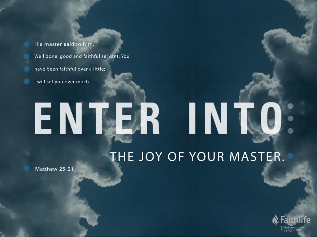 20 “So he who had received five talents came and brought five other talents, saying, ‘Lord, you delivered to me five talents; look, I have gained five more talents besides them.’ 21 His lord said to him, ‘Well done, good and faithful servant; you were faithful over a few things, I will make you ruler over many things. Enter into the joy of your lord.’ 22 He also who had received two talents came and said, ‘Lord, you delivered to me two talents; look, I have gained two more talents besides them.’ 23 His lord said to him, ‘Well done, good and faithful servant; you have been faithful over a few things, I will make you ruler over many things. Enter into the joy of your lord.’