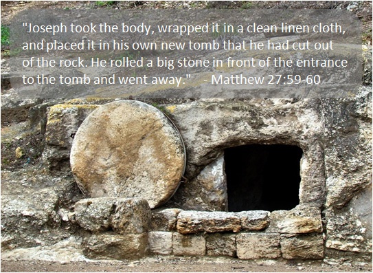 Jesus’ life and mission did not require long-term planning. His adult ministry lasted only three years. He would not require retirement benefits, geriatric care, or funeral pre-planning. He only had to borrow a tomb, because He would only require a short-term stay. Joseph, a disciple of Jesus, loaned him a tomb out of love and care for Christ. The tomb was new, just recently prepared, so Jesus’ was the only body in it. This was a tomb carved out of a large rock formation, possibly at the base of Calvary, and they rolled a large stone (a round flat stone set in a track) in front of the entrance to seal the tomb. Due to the onset of the Sabbath, they could only wrap the body in a clean cloth and leave it until the Sabbath had passed, and then come back and prepare the body for proper burial.