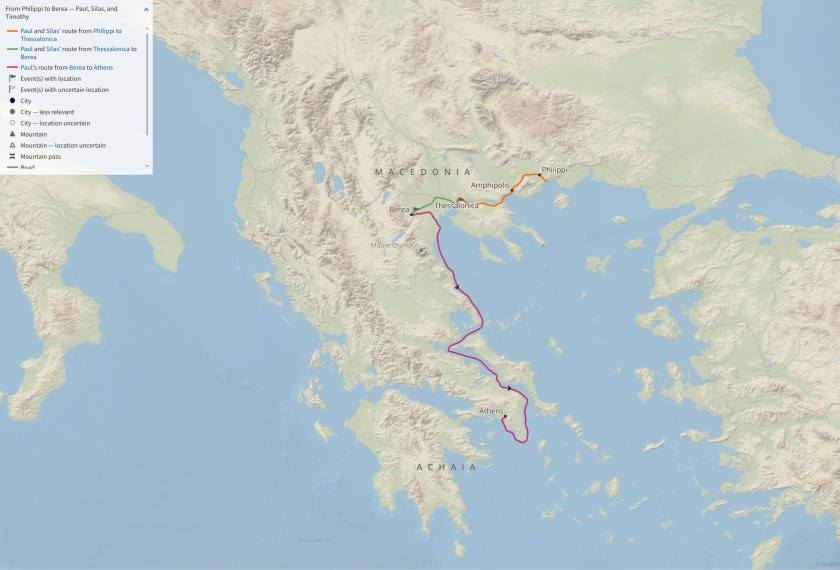 Paul, Silas, and Timothy went from Thessalonica to Berea, and met with great success there to begin with. However, the opposition in Thessalonica heard of Paul’s success and sent protesters to Berea. The opposition was so strong that the believers there sent Paul away to Athens while Silas and Timothy stayed behind. Not long after he arrived in Athens, though, he sent for his colleagues, and they left Berea as well.