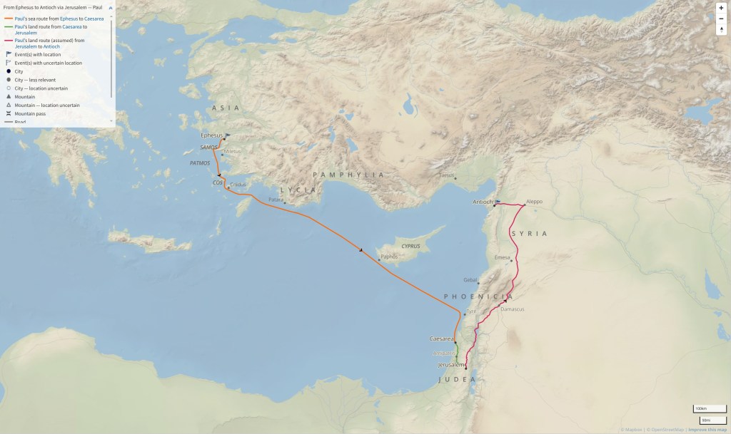 Paul continued ministering among the people on his journey, but purposed to go to Jerusalem for a Jewish feast. He stopped in Ephesus along the way and promised to come back later if possible. Aquila and Priscilla stayed in Ephesus at this time. He then sailed to Caesarea and went down to greet the church for the feast in Jerusalem. This whirlwind tour eventually took him to Antioch, Galatia, and Phrygia.