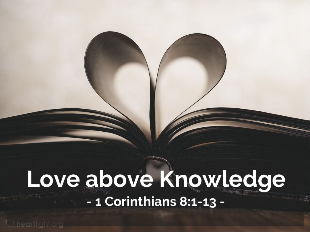 1 Now concerning things offered to idols: We know that we all have knowledge. Knowledge puffs up, but love edifies. 2 And if anyone thinks that he knows anything, he knows nothing yet as he ought to know. 3 But if anyone loves God, this one is known by Him.