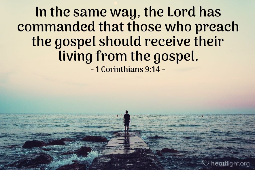 Paul continues his discussion of ministers being paid for their work as vocational ministers. Paul reasons that if a person is performing ministry as his or her primary work in life, how is that any different from one who is a soldier or vinedresser or shepherd? He quotes Deuteronomy’s statement that one should not stop an ox from eating the grain as he treads it, and reminds the reader that God cares much more about a person doing ministry than an ox. He uses further analogies, and then sums up the thought with a clear statement: “the Lord has commanded that those who preach the gospel should live from the gospel.”