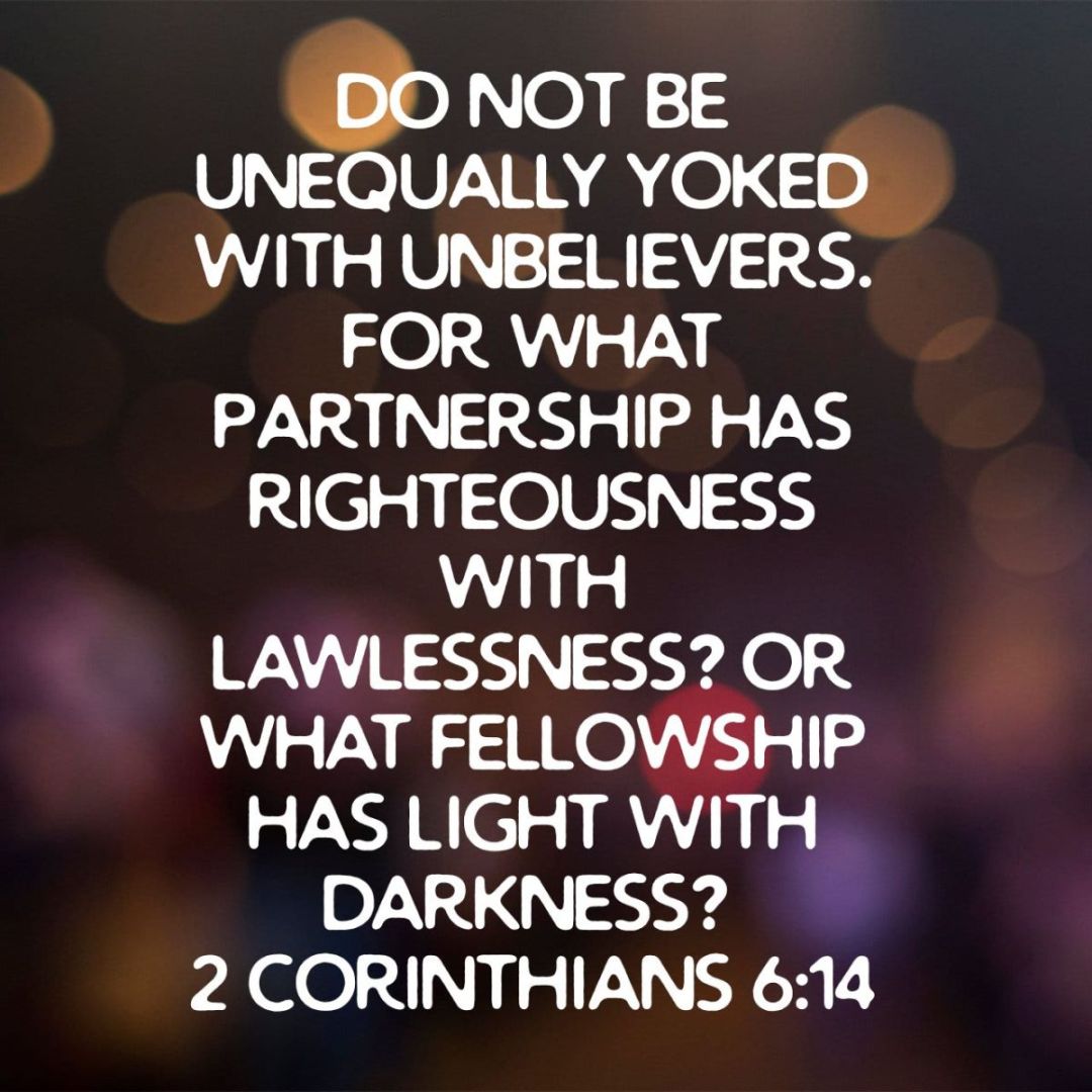 14 Do not be unequally yoked together with unbelievers. For what fellowship has righteousness with lawlessness? And what communion has light with darkness? 15 And what accord has Christ with Belial? Or what part has a believer with an unbeliever? 16 And what agreement has the temple of God with idols? For you are the temple of the living God. As God has said:“I will dwell in them