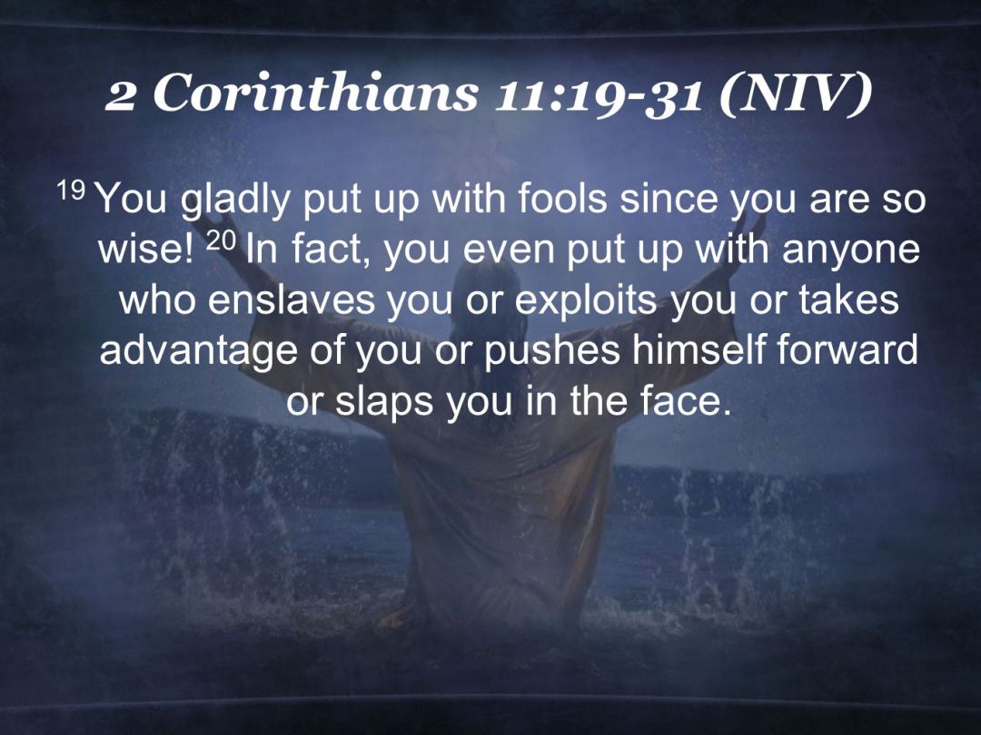 Paul goes back to his discussion thread of the fool. He speaks of foolish things, of which he was accused by some. He reminds them that this accusation is false and instructs them not to think of him as a fool. However, if they must be so gullible, then they should think of him as a fool, because they have entertained and heard the boasting of other fools that has led them into error. Therefore, Paul asks for the right to boast a bit (rather sarcastically) in his own validity. He notes their willingness to put up with fools, and is mocking their naivety. The Corinthians think they are wise, but actually are susceptible to false teachers and arrogant people. He cites the ungodly ways the fools they have entertained have treated them: bondage, devouring, stealing, pride, and humiliation. Paul addresses their boldness and declares his boldness in defending the Corinthians and in defending his own status as their spiritual father. In an embryonic church, false doctrine can rise up quickly, without an established leader to oppose such doctrine. Paul is addressing the false doctrine from a distance, and scolding the church for allowing such things to be taught, and for allowing his leadership to be questioned. Again, Paul stands up for himself and his church, and leads them to a stronger position in the faith.
