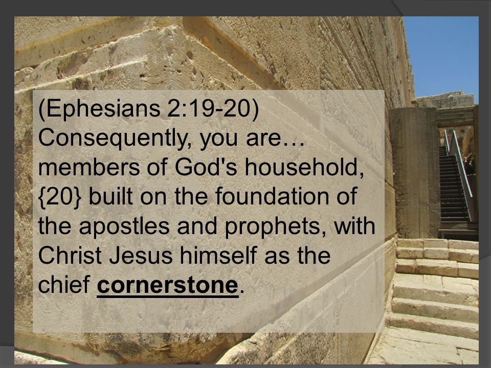 19 Now, therefore, you are no longer strangers and foreigners, but fellow citizens with the saints and members of the household of God, 20 having been built on the foundation of the apostles and prophets, Jesus Christ Himself being the chief cornerstone, 21 in whom the whole building, being fitted together, grows into a holy temple in the Lord, 22 in whom you also are being built together for a dwelling place of God in the Spirit.