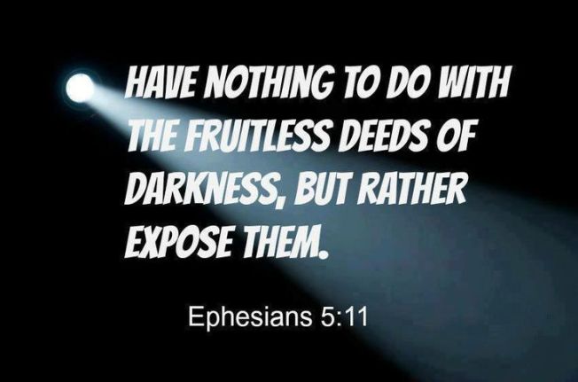 8 For you were once darkness, but now you are light in the Lord. Walk as children of light 9 (for the fruit of the Spirit is in all goodness, righteousness, and truth), 10 finding out what is acceptable to the Lord. 11 And have no fellowship with the unfruitful works of darkness, but rather expose them. 12 For it is shameful even to speak of those things which are done by them in secret. 13 But all things that are exposed are made manifest by the light, for whatever makes manifest is light. 14 Therefore He says: