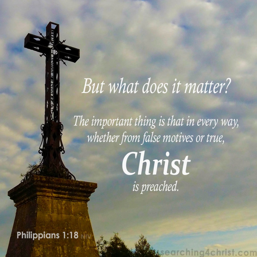 15 Some indeed preach Christ even from envy and strife, and some also from goodwill: 16 The former preach Christ from selfish ambition, not sincerely, supposing to add affliction to my chains; 17 but the latter out of love, knowing that I am appointed for the defense of the gospel. 18 What then? Only that in every way, whether in pretense or in truth, Christ is preached; and in this I rejoice, yes, and will rejoice.