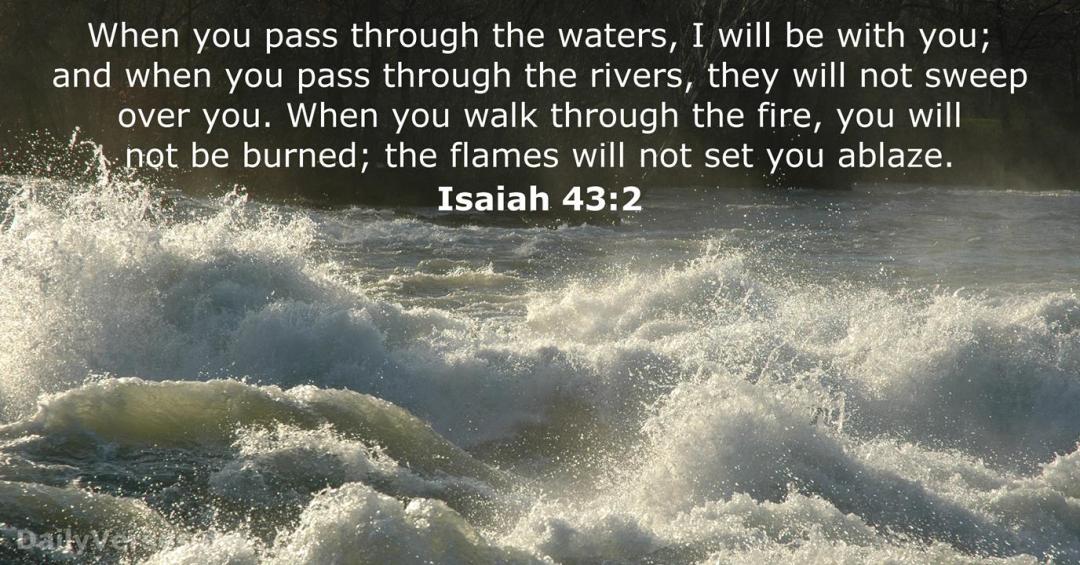 2 When you pass through the waters, I will be with you; and through the rivers, they shall not overflow you. When you walk through the fire, you shall not be burned, nor shall the flame scorch you.