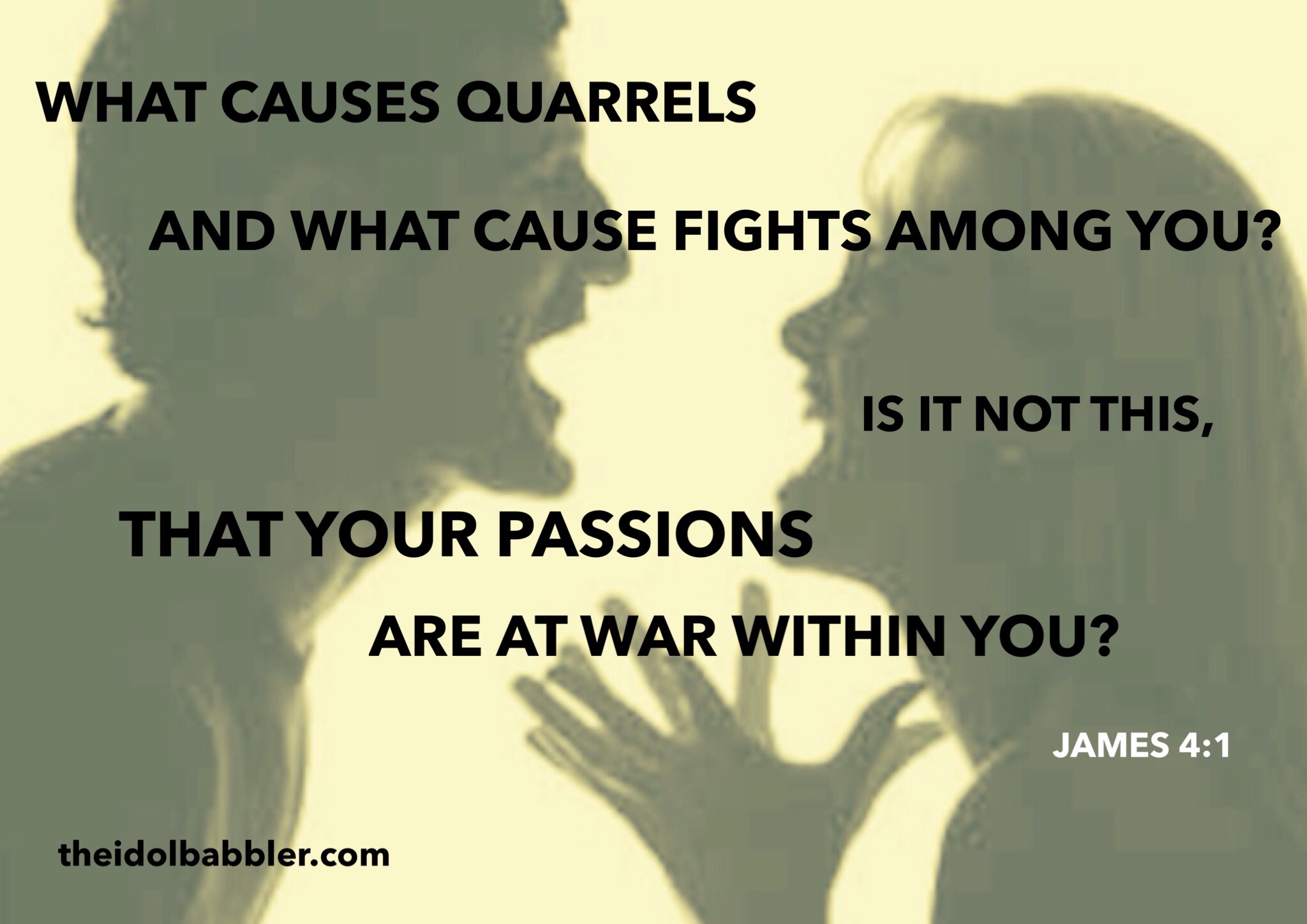 From that discussion of wisdom, James moves into the cause of problems in relationships. “Where do wars and fights come from among you?” He then identifies the source of these fights as the desire for pleasure in the members of the body of Christ. This is an indictment of the worldly wisdom described previously, which seeks one’s own desires instead of the desires of God and the needs of others. Verse two spells out the idiocy of such an attitude: “You lust and do not have. You murder and covet and cannot obtain. You fight and war. Yet you do not have because you do not ask.” This selfish attitude, seeking one’s own desires, gets in the way of receiving what is truly valuable. When an individual constantly chases what he or she thinks they need, what they desire in spite of the instruction of God, they never have what they think they want, nor do they get what they really need!