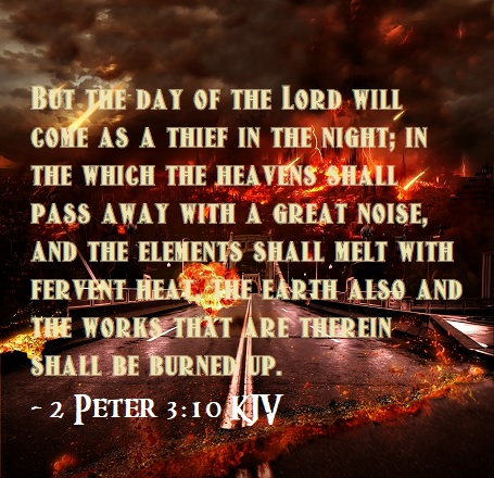 10 But the day of the Lord will come as a thief in the night, in which the heavens will pass away with a great noise, and the elements will melt with fervent heat; both the earth and the works that are in it will be burned up. 11 Therefore, since all these things will be dissolved, what manner of persons ought you to be in holy conduct and godliness, 12 looking for and hastening the coming of the day of God, because of which the heavens will be dissolved, being on fire, and the elements will melt with fervent heat? 13 Nevertheless we, according to His promise, look for new heavens and a new earth in which righteousness dwells.