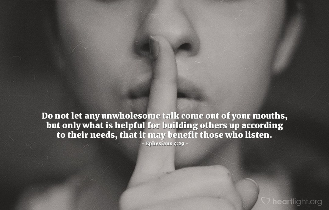 29 Let no corrupt word proceed out of your mouth, but what is good for necessary edification, that it may impart grace to the hearers. 30 And do not grieve the Holy Spirit of God, by whom you were sealed for the day of redemption. 31 Let all bitterness, wrath, anger, clamor, and evil speaking be put away from you, with all malice. 32 And be kind to one another, tenderhearted, forgiving one another, even as God in Christ forgave you.