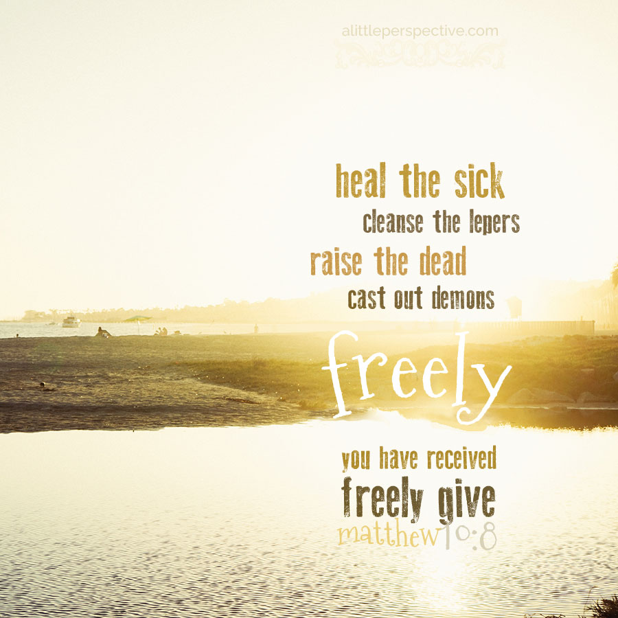 These twelve Jesus sent out and commanded them, saying: “Do not go into the way of the Gentiles, and do not enter a city of the Samaritans. But go rather to the lost sheep of the house of Israel. And as you go, preach, saying, ‘The kingdom of heaven is at hand.’ Heal the sick, cleanse the lepers, raise the dead, cast out demons. Freely you have received, freely give. Provide neither gold nor silver nor copper in your money belts, 10 nor bag for your journey, nor two tunics, nor sandals, nor staffs; for a worker is worthy of his food.