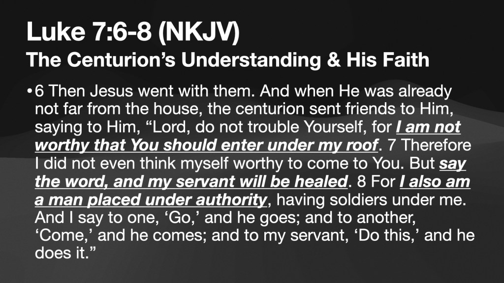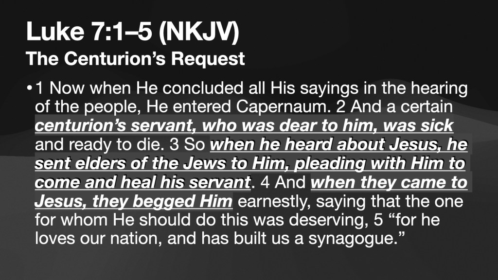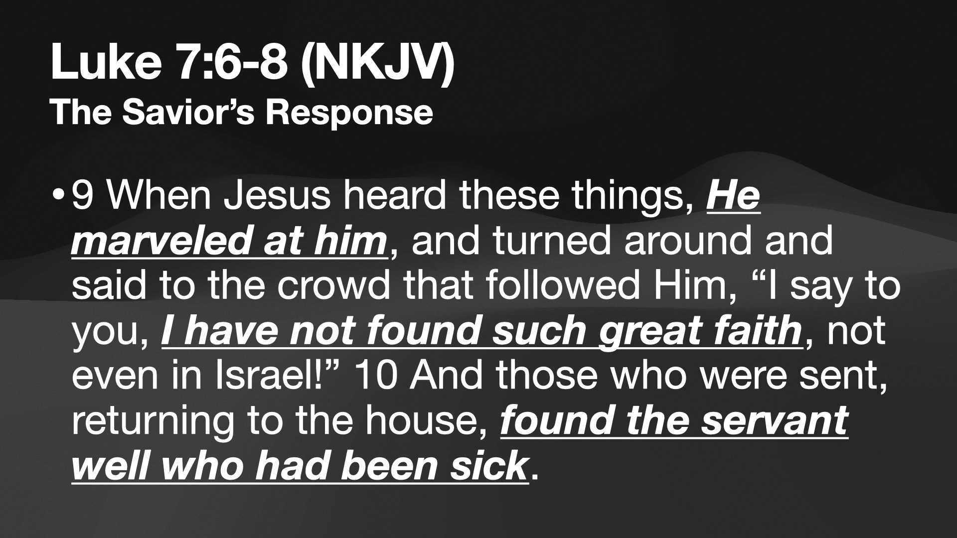 In our Scripture for today, we will discuss the one mentioned in Luke 7. A centurion at Capernaum pleaded for the life of his dying servant because he believed that diseases would obey Jesus just as his soldiers obeyed him (Mt 8:5–13; Lk 7:2–10). In spite of his high-ranking position, he was a humble man, willing to admit his inadequacy and helplessness. He cared deeply for his servant’s welfare. Jesus marveled at that example of faith and healed the sick man.